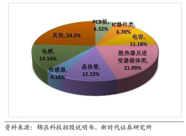 以錦浪科技和固德威為例進(jìn)行成本拆分。光伏逆變器生產(chǎn)所需的主要材料包括機(jī)構(gòu)件、電子元器件以及輔助材料等。其中機(jī)構(gòu)件主要為塑膠件、壓鑄件、鈑金件、散熱器等;電子元器件包括功率半導(dǎo)體器件、集成電路、電感、PCB線路板、電容、開關(guān)器件、連接器等;輔助材料主要包括膠水、包材、絕緣材料等。以錦浪科技和固德威為代表,原材料成本拆分如下: