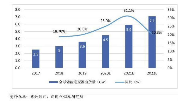 預(yù)計2022年儲能逆變器出貨量達(dá)7.1GW。間歇性發(fā)電特征是制約光伏拓展市場的瓶頸之一,儲能逆變器作為保障連續(xù)電力供應(yīng)的首選解決方案,同時受惠成本下降及政策支持,正在成為傳統(tǒng)逆變器廠家的一個新的戰(zhàn)略先手。2019年,全球儲能逆變器出貨量上升至3.6GW,同比2018年增長20%。預(yù)計到2022年底,全球儲能逆變器需求將達(dá)到7.1GW,市場前景不容小覷。