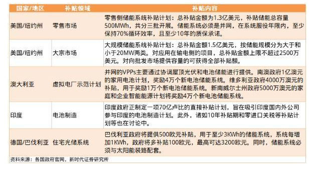 補貼政策推動儲能發(fā)展,“光伏+儲能”大勢所趨。為了推動低碳社會、可再生能源的發(fā)展,多個國家、地區(qū)或州政府出臺補貼政策,促進(jìn)儲能的生產(chǎn)以及在不同領(lǐng)域的安裝和應(yīng)用。在歐洲及大洋洲部分電費較高國家,光伏加裝儲能可以最大限度實現(xiàn)能源的自發(fā)自用,極大降低家庭電費支出,美國加州的SGIP政策、德國、澳洲部分州政府的戶用儲能補貼政策都促進(jìn)本國當(dāng)?shù)貎δ艿陌l(fā)展。