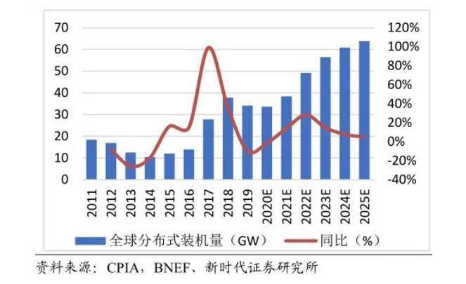 全球分布式市場蓬勃發(fā)展,2025年預(yù)計新增裝機(jī)64GW。根據(jù)BNEF數(shù)據(jù)顯示,2011-2019年全球新增光伏裝機(jī)量CAGR為19.4%,2019年裝機(jī)量達(dá)到120GW,其中分布式光伏34.1GW。2018年由于“531”光伏新政出臺,淘汰落后中小企業(yè)產(chǎn)能,行業(yè)加速出清,國內(nèi)新增光伏裝機(jī)量44.3GW,同比下降16.4%。2019年光伏競價政策出臺較晚、項目建設(shè)時間短,國內(nèi)光伏新增裝機(jī)再度下降至30.1GW,同比下降32%,其中地面電站和工商業(yè)項目顯著收縮,分布式光伏裝機(jī)量上升。未來隨著國內(nèi)外疫情逐步穩(wěn)定,產(chǎn)業(yè)復(fù)工復(fù)產(chǎn),預(yù)計2025年光伏新增裝機(jī)量可達(dá)到205GW,其中分布式預(yù)計新增64GW。