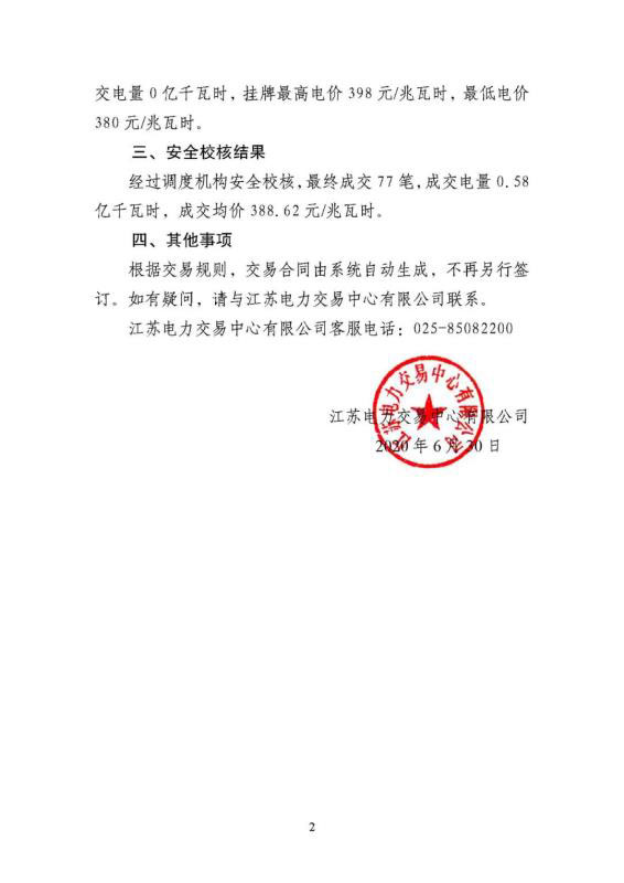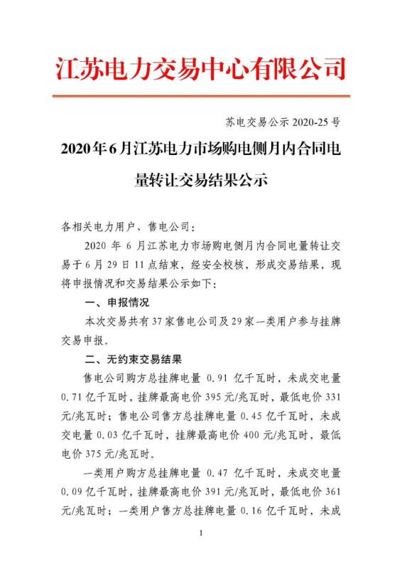 2020年6月江蘇電力市場(chǎng)購(gòu)電側(cè)月內(nèi)合同電量轉(zhuǎn)讓交易結(jié)果公示
