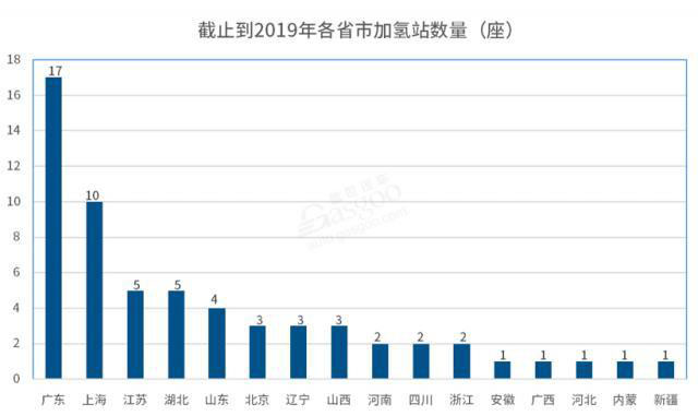 分地區(qū)來(lái)看,截止到 2019 年底,全國(guó)已經(jīng)有 16 個(gè)省市建成了加氫站,分布比較散。61 座加氫站主要分布在廣東(以佛山為主)、上海、江蘇等地,其他地區(qū)數(shù)量較少。