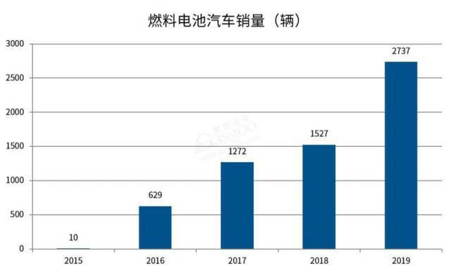 從 2019 年銷量來(lái)看,我國(guó)燃料電池汽車銷量增速明顯,全年銷售 2737 輛。從 2015 年僅有的 10 輛到 2019 年底,我國(guó)燃料電池汽車?yán)塾?jì)銷量超過(guò) 6500 輛,已達(dá)成“實(shí)現(xiàn) 5000 輛氫燃料電池汽車規(guī)?!钡碾A段性目標(biāo)。