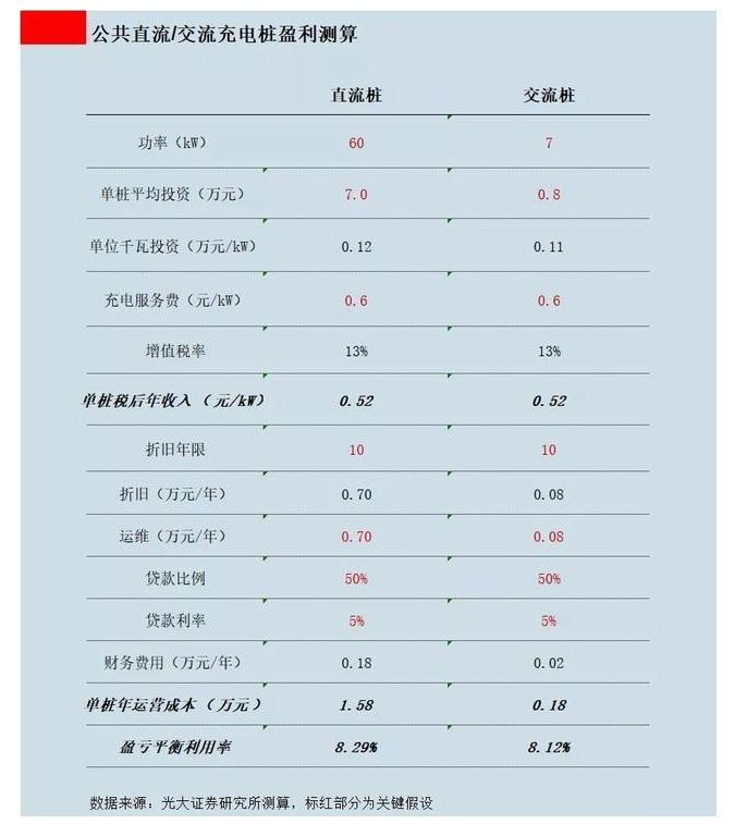 光大證券數(shù)據(jù)顯示,要達(dá)到典型的60kW直流樁和7kW交流樁的盈虧平衡點(diǎn)時(shí)的充電利用率,分別需要 8.29%和 8.12%。