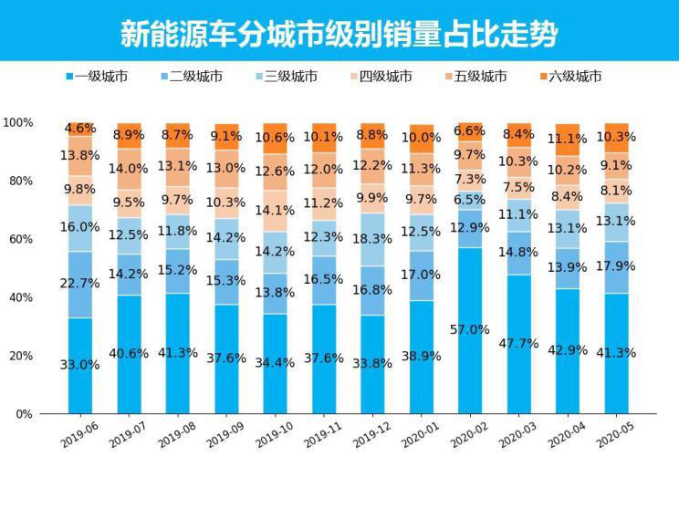 5月新能源車(chē)銷(xiāo)量最高的城市級(jí)別為一級(jí)城市,銷(xiāo)量為2.5萬(wàn)輛,銷(xiāo)量占比為41.3%,比上個(gè)月下跌了1.6個(gè)百分點(diǎn);與去年同期相比,一級(jí)城市下跌8個(gè)百分點(diǎn)。銷(xiāo)量最低的城市級(jí)別為四級(jí)城市,銷(xiāo)量?jī)H為0.5萬(wàn)輛,銷(xiāo)量占比為8.1%,比上個(gè)月下跌了0.3個(gè)百分點(diǎn);與去年同期相比,四級(jí)城市下跌1.3個(gè)百分點(diǎn)。