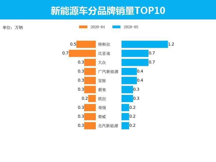 從品牌角度來(lái)看,5月新能源車(chē)銷(xiāo)量最高的五個(gè)品牌分別為特斯拉、比亞迪、大眾、廣汽新能源、寶駿,其銷(xiāo)量分別為1.2萬(wàn)輛、0.7萬(wàn)輛、0.7萬(wàn)輛、0.4萬(wàn)輛、0.4萬(wàn)輛,占新能源車(chē)當(dāng)月銷(xiāo)售總量的55.0%。整體來(lái)看,前十品牌依然以傳統(tǒng)車(chē)企為主,但特斯拉等造車(chē)新勢(shì)力的強(qiáng)勢(shì)出擊,吸引了一部分消費(fèi)者的關(guān)注,對(duì)傳統(tǒng)新能源生產(chǎn)廠商產(chǎn)生了一定的沖擊。