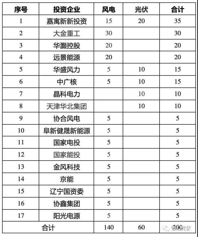 從投資企業(yè)來(lái)看,嘉寓新新投資獲得風(fēng)電、光伏項(xiàng)目最大,總規(guī)模35萬(wàn)kW;其他企業(yè)的規(guī)模如下表所示。
