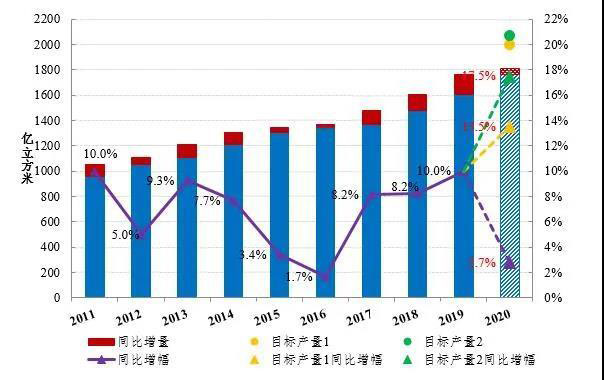 為了擴(kuò)大清潔能源利用規(guī)模,政府對提高天然氣產(chǎn)能一直抱有較高的期望,但在資源條件、改革進(jìn)程和體制機(jī)制等多方面的約束下,實(shí)際效果不盡如人意,頁巖氣和煤層氣實(shí)際產(chǎn)量屢次未能達(dá)到規(guī)劃目標(biāo)。2016年發(fā)布的《天然氣發(fā)展“十三五”規(guī)劃》提出,2020年天然氣產(chǎn)量預(yù)期目標(biāo)為2070億立方米,2018年9月發(fā)布的《關(guān)于促進(jìn)天然氣協(xié)調(diào)穩(wěn)定發(fā)展的若干意見》提出,2020年產(chǎn)量目標(biāo)2000億立方米以上。若要實(shí)現(xiàn)“十三五”產(chǎn)量目標(biāo),意味著2020年產(chǎn)量增長率要達(dá)到17.5%;若要實(shí)現(xiàn)2018年提出的2020年產(chǎn)量目標(biāo),增長率也需達(dá)到13.5%(見圖1)。從目前來看,實(shí)現(xiàn)這些目標(biāo)都有困難。