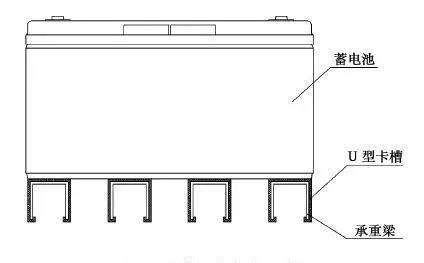 在電池抗震鐵架每層鐵架構(gòu)件(承重梁)與電池殼體接觸部分上襯以塑料絕緣護(hù)套,將金屬承重梁全包裹,如圖2所示,其作用就是將電池與金屬電池架之間隔開,防止漏下的腐蝕性液體將電池與架間導(dǎo)通,發(fā)生電氣短路。絕緣護(hù)套也可以叫做U型卡槽或承重梁護(hù)套,一般設(shè)計(jì)成U形卡在電池承重梁上。材質(zhì)選阻燃PVC、ABS或PP等塑料材質(zhì),光滑、耐磨、抗壓力好,安裝方便。且不影響電池上下層通風(fēng)散熱。缺點(diǎn)是不能承接液體,液體量大會(huì)流到下層電池上產(chǎn)生腐蝕。絕緣護(hù)套需要根據(jù)承重梁形狀專門定制開塑料模具。