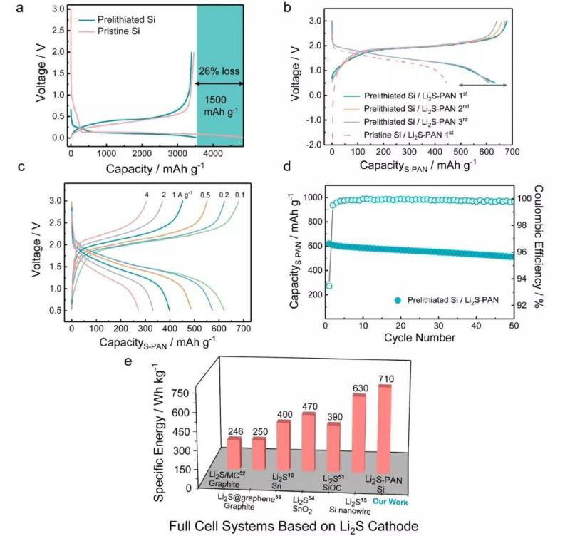 圖4. 預(yù)鋰化Si負極及Si/Li2S-PAN全電池的性能:a)Si負極預(yù)鋰化前后的首周充放電曲線;b)預(yù)鋰化前后的Si電極分別與Li2S-PAN匹配全電池的充放電曲線;c)Si/Li2S-PAN全電池在不同電流下的性能;d)Si/Li2S-PAN全電池在100 mA g-1下的循環(huán)性能;e)Si/Li2S-PAN全電池與文獻報道的基于Li2S正極的全電池的能量密度對比柱狀圖。