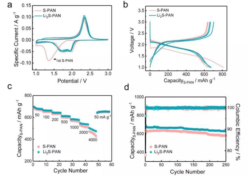 圖3. S-PAN電極預(yù)鋰化前后的電化學(xué)性能對比:a)S-PAN電極預(yù)鋰化前后的前三周CV曲線;b)S-PAN電極預(yù)鋰化前后的前三周充放電曲線;c)S-PAN電極預(yù)鋰化前后的倍率性能;d)S-PAN電極預(yù)鋰化前后的長循環(huán)性能。