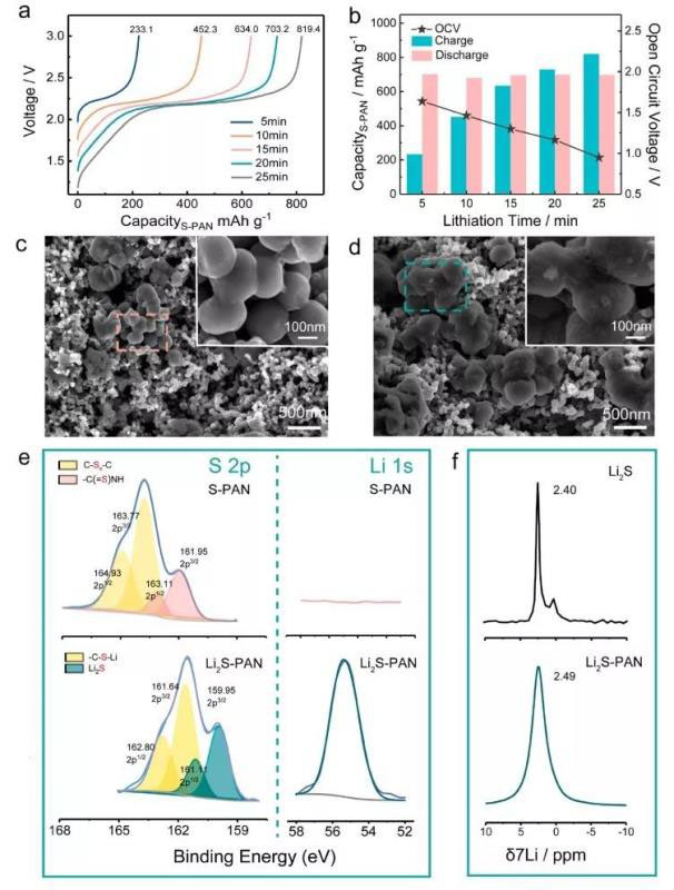 圖2. S-PAN正極預(yù)鋰化條件的探索及預(yù)鋰化前后的表征:a) 不同預(yù)鋰化時間下S-PAN電極的首周充電曲線;b)不同預(yù)鋰化時間下S-PAN電極的首周充放電容量柱狀圖;c,d)S-PAN電極預(yù)鋰化前后的SEM圖;e)S-PAN電極預(yù)鋰化前后的S2p,Li1s的XPS譜圖;f) Li2S-PAN電極與Li2S的固體核磁7Li譜的對比。