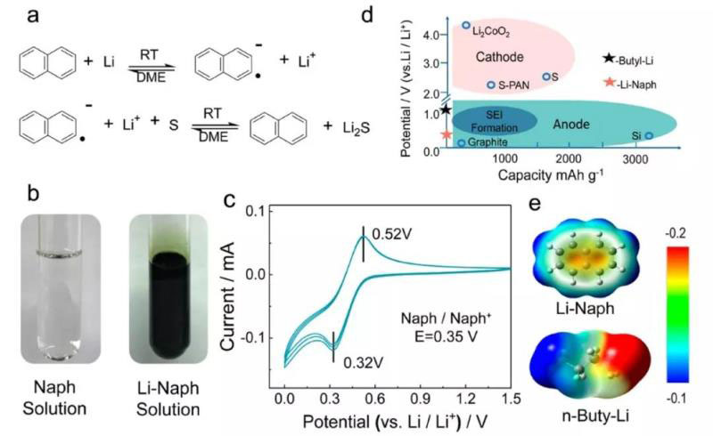 圖1. 鋰化試劑萘鋰的物化性質(zhì):a) 萘鋰試劑的制備和硫電極的鋰化方程式;b)萘和萘鋰的DME溶液的圖片;c)萘的CV曲線;d)文章中相關(guān)材料的電極電勢示意圖;e) 萘鋰和丁基鋰的表面靜電勢分布圖。