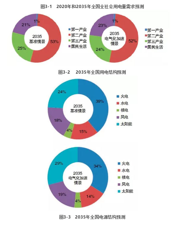 黨的十九大報(bào)告明確提出,2035年要基本實(shí)現(xiàn)社會(huì)主義現(xiàn)代化,2050年要建成富強(qiáng)民主文明和諧美麗的社會(huì)主義現(xiàn)代化強(qiáng)國(guó)。據(jù)有關(guān)機(jī)構(gòu)預(yù)測(cè),2035年我國(guó)GDP將達(dá)到32萬(wàn)億美元,年均增速仍將保持4%~5%,城鎮(zhèn)化率將由現(xiàn)在的近60%提升到70%~75%。綜合考慮需求增長(zhǎng)、能效提升等因素,預(yù)計(jì)2020~2035年我國(guó)用電量年均增速在2.7%~3.3%之間,到2035年,我國(guó)全社會(huì)用電量將達(dá)到11.4~12.4萬(wàn)億千瓦時(shí),人均用電量、人均生活用電量分別達(dá)到8000、1900千瓦時(shí),發(fā)電能源占比有望達(dá)到57%,終端用電占比達(dá)到38%,與發(fā)達(dá)國(guó)家的電氣化水平差距將顯著縮小。