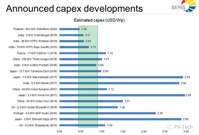 SERIS稱,漂浮光伏電站項目受場地條件、環(huán)境、規(guī)模的影響,不同條件下的投資成本相差很大:如泰國表現(xiàn)出最低投資成本58.5兆瓦項目(0.48美元/瓦),而最高是日本1.5兆瓦的項目(2.93美元/瓦)。