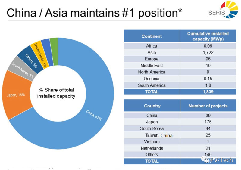 根據(jù)新加坡太陽能研究所(SERIS)最新報告,2019年漂浮光伏項目新增裝機583兆瓦,到2020年6月全球累計裝機1,839兆瓦,而中國大陸占比67%。