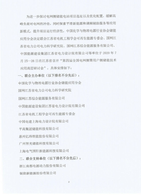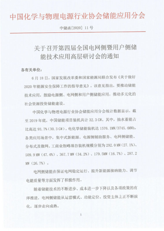 關(guān)于召開第四屆全國電網(wǎng)側(cè)暨用戶側(cè)儲能技術(shù)應用高層研討會的通知