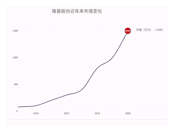2012年4月上市初時,隆基股份市值僅約60億元;到2014年,其市值突破百億。2019年,這家單晶龍頭股價翻倍,市值突破千億,上演了“5年10倍、7年15倍”的神話。