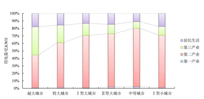 (3)超大城市用電結(jié)構(gòu)已接近發(fā)達國家水平,結(jié)構(gòu)調(diào)整效果顯著,其他類型城市第三產(chǎn)業(yè)占比仍較低,第二產(chǎn)業(yè)占據(jù)明顯主導地位。