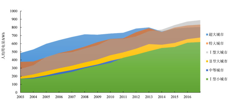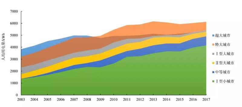 具體通過各類型城市人均用電量增速來看,超大城市的用電增速在各城市類型里是最低的,其次是特大城市,Ⅰ型大城市、Ⅱ型大城市、中等城市、Ⅰ型小城市的用電增速基本呈逐類型城市升高的趨勢,其中Ⅰ型小城市的用電量波動幅度最大。各類型城市2003-2017年的用電量平均增速分別為2.3%、4.7%、6.2%、8.3%、9.6%、8.4%。