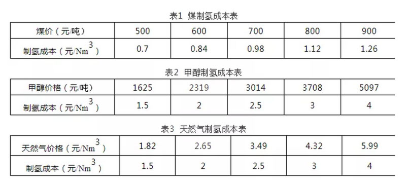 目前市場(chǎng)成熟制氫方式主要包括煤氣化制氫、甲醇制氫、天然氣制氫以及工業(yè)副產(chǎn)品制氫。煤氣化制氫投資成本較高,隨著規(guī)模增大,單位投資大幅下降,同時(shí)原料便宜,按照5800大卡煙煤計(jì)算,價(jià)格為500元/噸時(shí)制氫成本僅為0.7元/Nm3(表1);甲醇制氫投資較低,適合2500Nm3以下制氫規(guī)模,按照1Nm3氫氣消耗0.72千克甲醇,甲醇價(jià)格按2319元/噸計(jì)算,制氫成本如表2;天然氣制氫單位投資成本低,在1000Nm3以上經(jīng)濟(jì)性較好,按照1Nm3氫氣消耗0.6Nm3天然氣,天然氣價(jià)格按1.82元/Nm3計(jì)算,制氫成本如表3。
