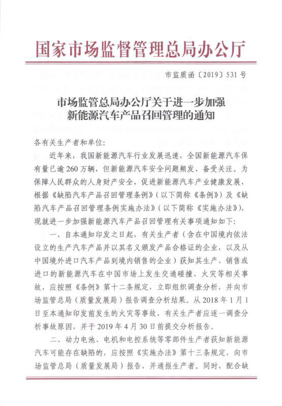 近年來,我國新能源汽車行業(yè)發(fā)展迅速,但新能源汽車安全問題頻發(fā)、備受關(guān)注。為保障人民群眾的人身財產(chǎn)安全,促進(jìn)新能汽車產(chǎn)業(yè)健康發(fā)展。國家市場監(jiān)督管理總局于2019年3月15日正式對外發(fā)布了《關(guān)于進(jìn)一步加強(qiáng)新能源汽車產(chǎn)品召回管理的通知》。