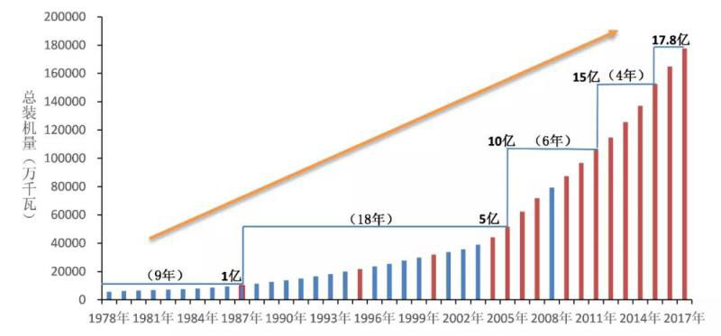圖1 改革開放以來我國電源裝機(jī)容量連上臺(tái)階