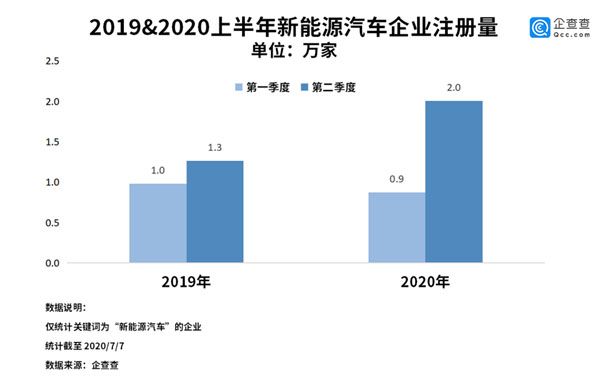 2020年1月至6月,我國(guó)新能源汽車相關(guān)企業(yè)注冊(cè)量為2.9萬(wàn)家,相比2019年同期上漲了26.1%。其中二季度數(shù)據(jù)為2萬(wàn)家,相比一季度環(huán)比上漲122.2%。