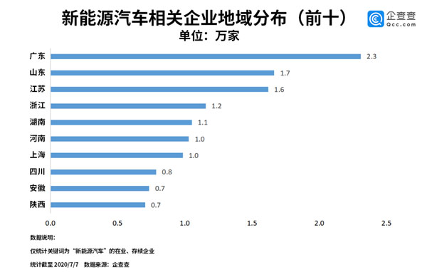 企查查數(shù)據(jù)顯示,目前我國(guó)新能源汽車相關(guān)的在業(yè)、存續(xù)企業(yè)共有19.2萬(wàn)家。從地域分布來(lái)看,上海是唯一入圍前十名的直轄市,共有1萬(wàn)家企業(yè)。各省份排名中,廣東省以2.3萬(wàn)家排名第一,山東和江蘇分列二三位。