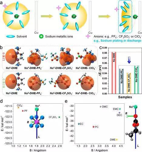 溶劑化殼層中溶劑的排列會影響陰離子的位置,因?yàn)椴煌腘a+溶劑相互作用的結(jié)合能和B值不同。例如,在1.0 M NaPF6/DME的情況下,我們發(fā)現(xiàn)PF6-與Na+具有中等結(jié)合能和較低的B值,因此,當(dāng)在電解液中使用EC/DEC溶劑時,Na陽極的性能稍差。PC溶劑的表現(xiàn)也與EC/DEC相似。這是因?yàn)镋C/DEC或PC與Na+的相互作用較弱,因此PF6-陰離子可以很容易地取代EC/DEC或PC,使其更接近Na金屬表面,從而引發(fā)表面反應(yīng)和腐蝕。相比之下,DME與Na+具有較強(qiáng)的鍵合(即形成五環(huán)絡(luò)合物)。因此,DME使PF6-陰離子遠(yuǎn)離Na電極表面,從而有效地抑制腐蝕。而DME不能輕易阻止ClO4-和CF3SO3-與Na+結(jié)合。這是因?yàn)镃lO4-具有高度自由度(即低位阻),而CF3SO3-與Na+有很強(qiáng)的相互作用,這使得這些陰離子很容易遷移。