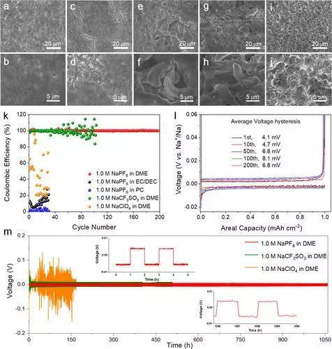 圖2. 電解質(zhì)在鈉陽極電鍍/剝離中的作用。在含有(a,b)NaPF6,(c,d)NaCF3O3,(e,f)NaClO4的1.0 M電解液中,以及含有NaPF6/EC/DEC或(i,j)PC溶劑的1.0 M電解液中鍍鈉的掃描電鏡。(k) 庫侖效率。(l) Na | Cu電池的電壓分布和平均電壓滯后。(m) Na | Na對稱電池的電壓-時間曲線。