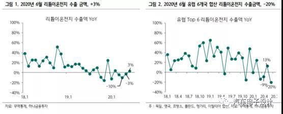 在韓國的證券報告里面,我找到了這樣的圖,有關(guān)于韓國二次電池出口的數(shù)據(jù)概覽,6月韓國二次電池出口量同比增長3%,已經(jīng)讀過了最近你的時期,之前在4月-10%,5月-3%。右邊這張圖可以看到歐洲主要的六個國家的出口合計同比增長是-20%,從5月的13%往下拉,而出口到波蘭汽車OEM密集區(qū)域的地方,同比下降了-82%。