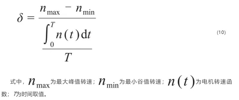 為了更直觀的體現(xiàn)電動(dòng)機(jī)轉(zhuǎn)速波動(dòng)情況,這里引入電動(dòng)機(jī)轉(zhuǎn)速不均勻系數(shù)δ,即轉(zhuǎn)速的波動(dòng)范圍與平均轉(zhuǎn)速的比值,其值越小表示電動(dòng)機(jī)運(yùn)行越平穩(wěn)。如式(10)所示