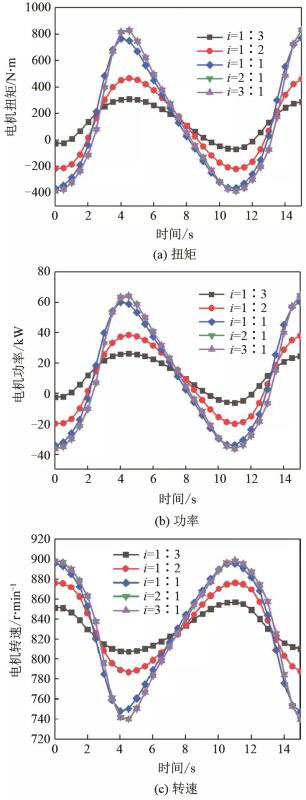 圖8 不同傳動(dòng)比對(duì)電機(jī)扭矩、功率和轉(zhuǎn)速的影響