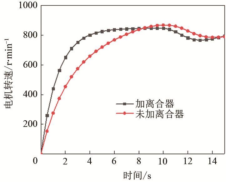 安裝離合器前后對(duì)電機(jī)啟動(dòng)時(shí)間曲線影響如圖7所示,仿真結(jié)果表明:對(duì)于轉(zhuǎn)動(dòng)慣量為40 kg·m2,傳動(dòng)比為1∶2的飛輪,安裝離合器前電機(jī)從啟動(dòng)至達(dá)到額定轉(zhuǎn)速需要6 s,當(dāng)安裝離合器后只需要4.5 s,啟動(dòng)時(shí)間縮短了1.5 s,說明安裝離合器能起到縮短電機(jī)啟動(dòng)時(shí)間的效果。