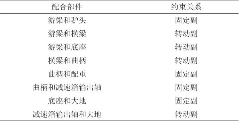 這里以某油田使用的CYJ10-3-37HB型游梁式抽油機(jī)為例,在建模時(shí),對(duì)不影響分析的抽油機(jī)部分細(xì)微結(jié)構(gòu)進(jìn)行簡(jiǎn)化,并做如下假設(shè):①忽略不隨系統(tǒng)運(yùn)動(dòng)的小部件如螺栓、墊片等;②各零部件等效為剛體,不會(huì)發(fā)生形變;③不考慮各運(yùn)動(dòng)部件間的摩擦力和帶輪、齒輪和曲柄連桿機(jī)構(gòu)的能量損耗。