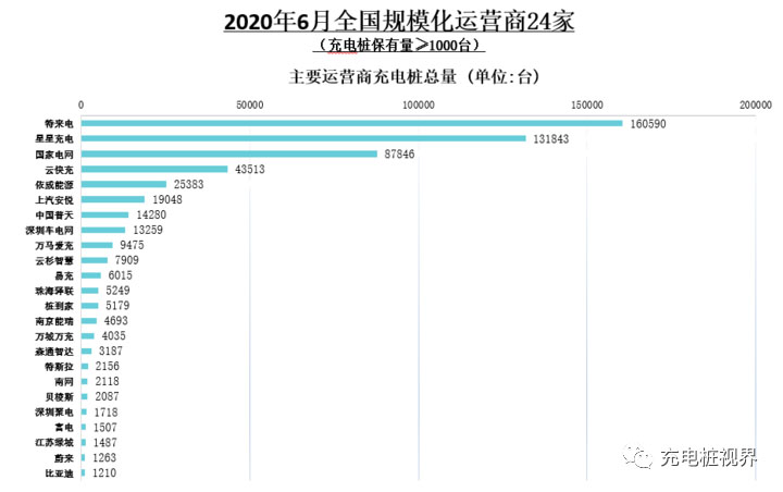 截止到2020年6月,全國充電運營企業(yè)所運營充電樁數(shù)量超過1萬臺的共有8家,分別為:特來電運營16.1萬臺、星星充電運營13.2萬臺、國家電網(wǎng)運營8.8萬臺、云快充運營4.4萬臺、依威能源運營2.5萬臺、上汽安悅運營1.9萬臺、中國普天運營1.4萬臺、深圳車電網(wǎng)運營1.3萬臺。這8家運營商占總量的88.8%,其余的運營商占總量的11.2%。