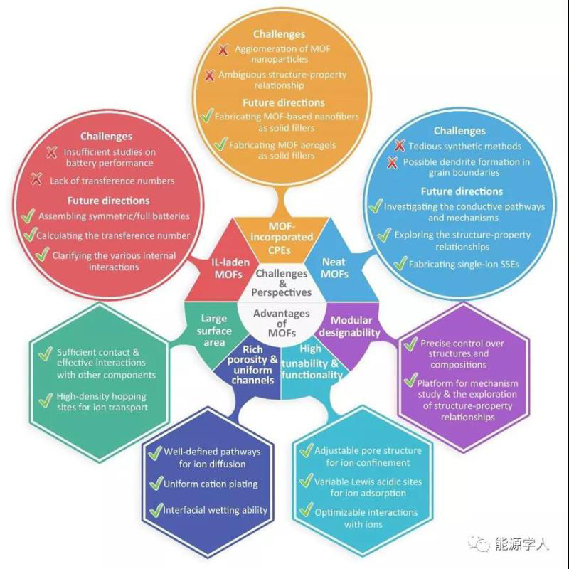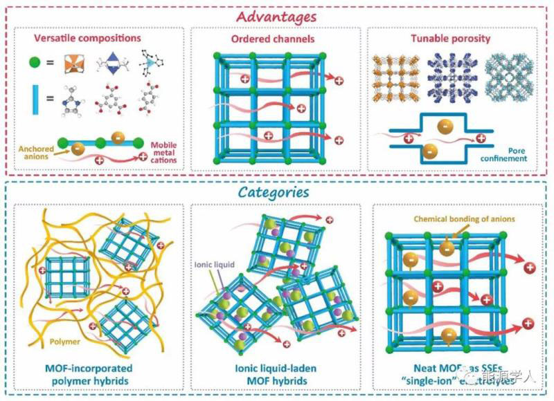 金屬-有機(jī)骨架(MOFs),也被稱為多孔配位聚合物,是一類快速增長的多孔晶體無機(jī)物-有機(jī)材料由金屬離子/團(tuán)簇和有機(jī)配體組成。近年來,MOFs在SSE系統(tǒng)中的應(yīng)用由于其絕緣特性和內(nèi)在特性而成為一個(gè)新的研究熱點(diǎn)?;瘜W(xué)成分、孔結(jié)構(gòu)和表面功能的多樣性賦予了MOFs高設(shè)計(jì)性,這為控制MOFs的物理化學(xué)性質(zhì)從而追求高性能SSEs提供了很大的機(jī)會。簡單地說,MOFs在SSEs中的優(yōu)點(diǎn)總結(jié)如圖1。