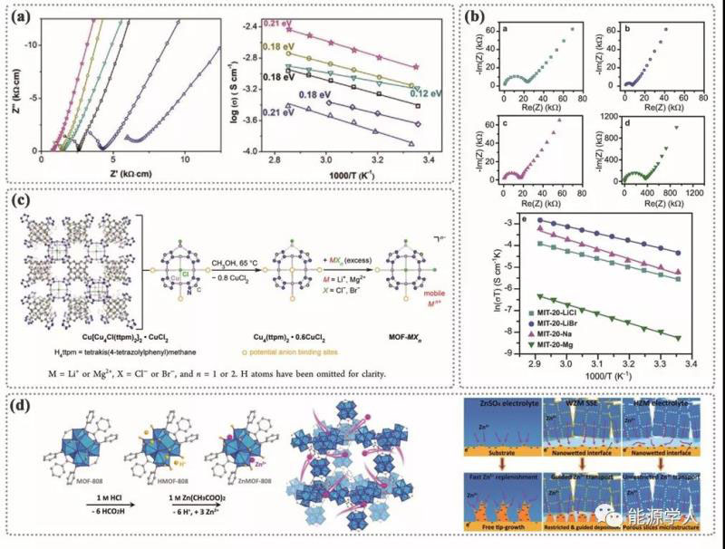 同時(shí)通過利用Cu-azolateMOF進(jìn)行Li+和Mg2+的傳導(dǎo),進(jìn)一步證明了具有中性和陰離子之間可逆轉(zhuǎn)變的MOFs是SSEs很有前途的候選者。圖4c顯示Cu-azolate MOF具有多個(gè)陰離子結(jié)合位點(diǎn),可與金屬鹵化鹽(LiCl、LiBr、MgCl2、MgBr2)反應(yīng)生成具有可移動陽離子平衡的陰離子框架。MOFs作為單離子SSEs,有利于優(yōu)化與電解質(zhì)的界面接觸。最近,Pan和同事報(bào)道了一種結(jié)晶Zn2+的SSE(簡稱WZM SSE),由合成后的MOF-808 ([Zr6O4(OH)4(HCOO)6(BTC)2])修飾而得到的(圖4d),MOF-808豐富的孔隙率和高濃度的[Zn(H2O)6]2+離子在SSE和Zn負(fù)極之間形成了納米界面,引導(dǎo)和限制了Zn的沉積。