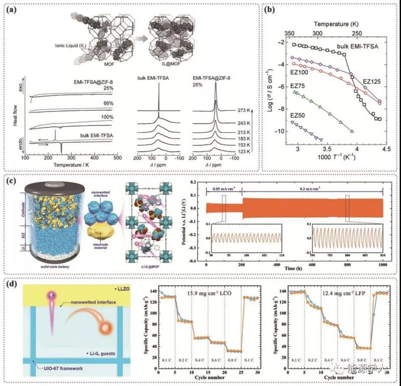 第一例的IL@MOF在2014年已被報(bào)道,由1-乙基-3-甲基咪唑雙(三氟甲基磺酰)酰胺(簡稱EMI-TFSA或EMIM-TFSI)和ZIF-8組成(圖3a)。從圖3b中看出與純EMI-TFSA相比,EMI-TFSA@ZIF-8在加熱過程中離子電導(dǎo)率的變化不同,在溫度低于250k時(shí),EMI-TFSA@ZIF-8表現(xiàn)出比純EMI-TFSA更優(yōu)異的離子電導(dǎo)率。另一個(gè)典型的例子(圖3c)報(bào)道了通過混合[EMIM0.8Li0.2][TFSI](記為Li-IL)與MOF -525(Cu)制備Li-IL@MOF復(fù)合材料,并通過組裝電池探究其電化學(xué)性能。在0.05和0.2 mA cm-2的電流密度下,保持在40和70 mV的小極化電壓下超過1000h,這反映了Li在長期沉積/剝離循環(huán)過程中Li-IL@MOF和Li金屬之間穩(wěn)定的界面。