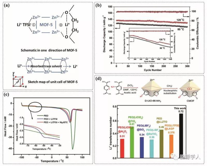 早先的研究提到了將MOF-5引入鋰二(三氟甲基磺)酰亞胺(表示為LiTFSI或LiTFSA)和聚(環(huán)氧乙烷)(表示為PEO)基質(zhì)中,原位制備復(fù)合聚合物電解質(zhì)(CPE)。如圖2a,作者推測MOF-5上的Lewis酸性位點(diǎn)與PEO鏈的烷氧和鋰鹽的陰離子相互作用,加速了PEO鏈的移動和鹽的離解。由于MOF-5的多孔特性,可以吸附CPE中的痕量溶劑,形成便于離子輸運(yùn)的通道,提高了離子電導(dǎo)率。比較了MOF-5和MIL-53(Al),發(fā)現(xiàn)MIL-53(Al)對水和氧具有顯著的穩(wěn)定性,成功地將相應(yīng)的PEO-MIL-53(Al)-LiTFSI電解質(zhì)在120℃的氧化電位提高到5.10V。在LiFePO4/PEO-MIL-53(Al)-LiTFSI/Li電池中,經(jīng)過300次循環(huán),在5℃和120℃下保持136.4 mAh g-1的高放電容量,展現(xiàn)了優(yōu)異的高速率性能和穩(wěn)定性(圖2b)。