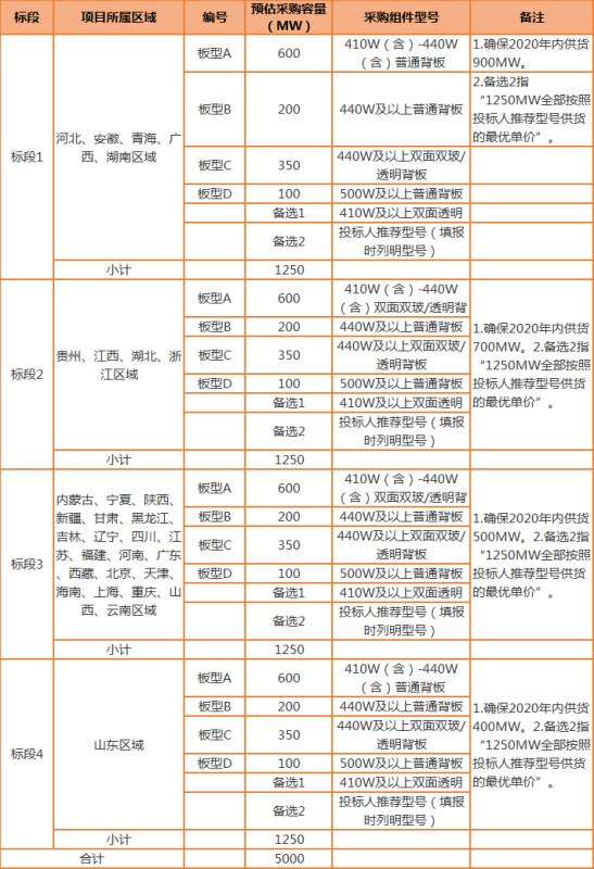 2.2標(biāo)段劃分:本次光伏組件招標(biāo)擬劃分為4個標(biāo)段,采購電壓等級為1500V光伏組件,預(yù)估采購總?cè)萘?000MW,其中基本容量4000MW,儲備容量1000MW。