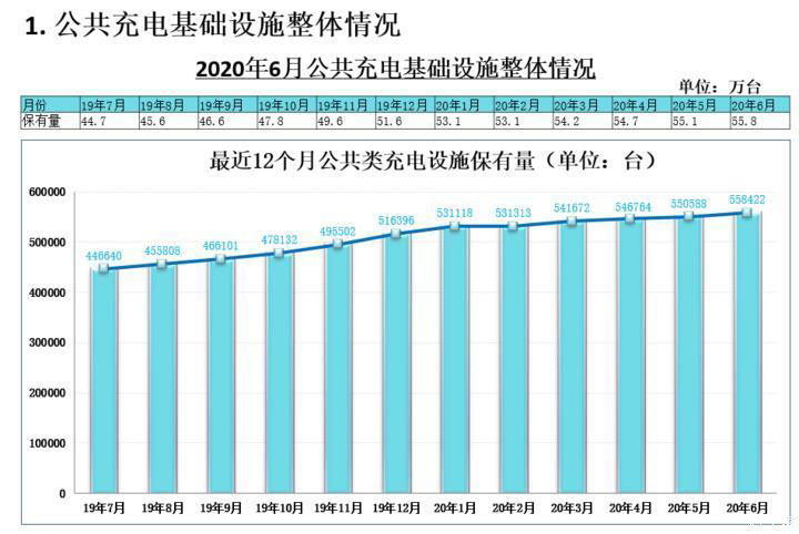 近日,中國(guó)電動(dòng)充電基礎(chǔ)設(shè)施促進(jìn)聯(lián)盟發(fā)布2020年6月充電樁運(yùn)營(yíng)數(shù)據(jù)。截至2020年6月,聯(lián)盟內(nèi)成員單位總計(jì)上報(bào)公共類充電樁55.8萬(wàn)臺(tái),全國(guó)充電基礎(chǔ)設(shè)施累計(jì)數(shù)量為132.2萬(wàn)臺(tái),同比增加31.9%。