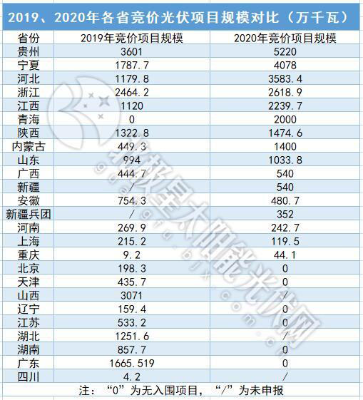 從最終入圍名單來看,26GW的總?cè)萘恳渤^2019年的22.8GW。其中最大規(guī)模為貴州省的5.2GW,此外規(guī)模超過2GW(包括)的省份由2019年的2個增加到2020年的6個,包括貴州、寧夏、河北、浙江、江西、青海。