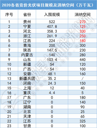 從上表不難發(fā)現(xiàn),貴州、寧夏、河北、浙江、江西5大競價光伏項目大省,規(guī)模均超出了消納空間,而江蘇、廣東、遼寧、甘肅消納能力超1GW的省又無競價項目入圍。