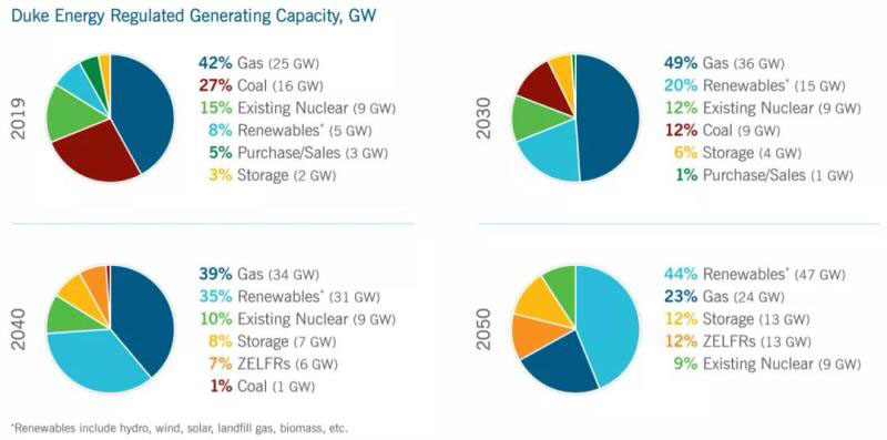 自2010年以來(lái),杜克能源已淘汰了總計(jì)超過(guò)6539MW的51座燃煤機(jī)組,并計(jì)劃在2024年底之前至少再淘汰862MW的燃煤電廠,約占全部燃煤電廠組合的三分之一。2019年,公司提議將卡羅萊納州和印第安納州的煤電產(chǎn)能的賬面壽命再縮短約7700MW。