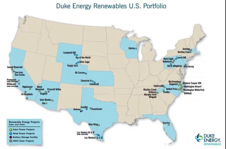 杜克能源可再生能源項(xiàng)目遍布美國(guó)19個(gè)州,其中一部分是收購(gòu)來(lái)的項(xiàng)目