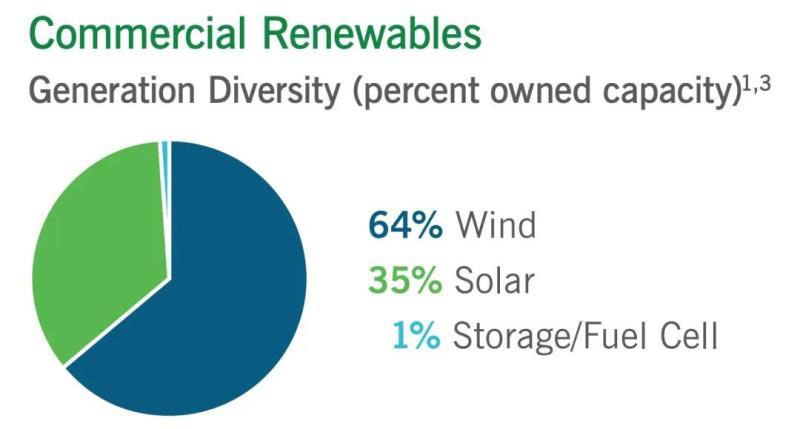 目前杜克能源商業(yè)可再生能源發(fā)電(不含水電)的分布情況,主要為風(fēng)能和太陽(yáng)能,分別占比64%和35%