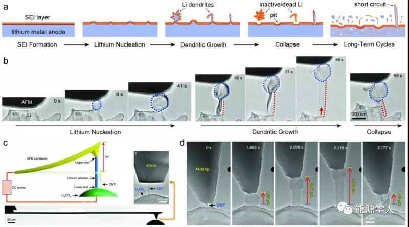 圖1. a)鋰枝晶形成和生長的演變示意圖, b)鋰成核、須晶生長和坍塌過程的TEM圖, c)用于監(jiān)測鋰枝晶演變的AFM-TEM裝置示意圖, d)鋰枝晶生長的實(shí)時(shí)TEM圖。