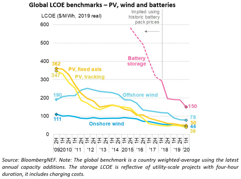 中國(guó)儲(chǔ)能網(wǎng)訊:根據(jù)彭博新能源財(cái)經(jīng)(BNEF)匯總的數(shù)據(jù)顯示,自2019年下半年以來(lái),陸上風(fēng)電和公用事業(yè)規(guī)模光伏發(fā)電的全球平準(zhǔn)化電力成本(LCOE)下降了9%和4%,分別為44美元和50美元/兆瓦時(shí)。與此同時(shí),電池存儲(chǔ)的平準(zhǔn)成本LCOE已跌至150美元/MWh,大約是兩年前的一半。